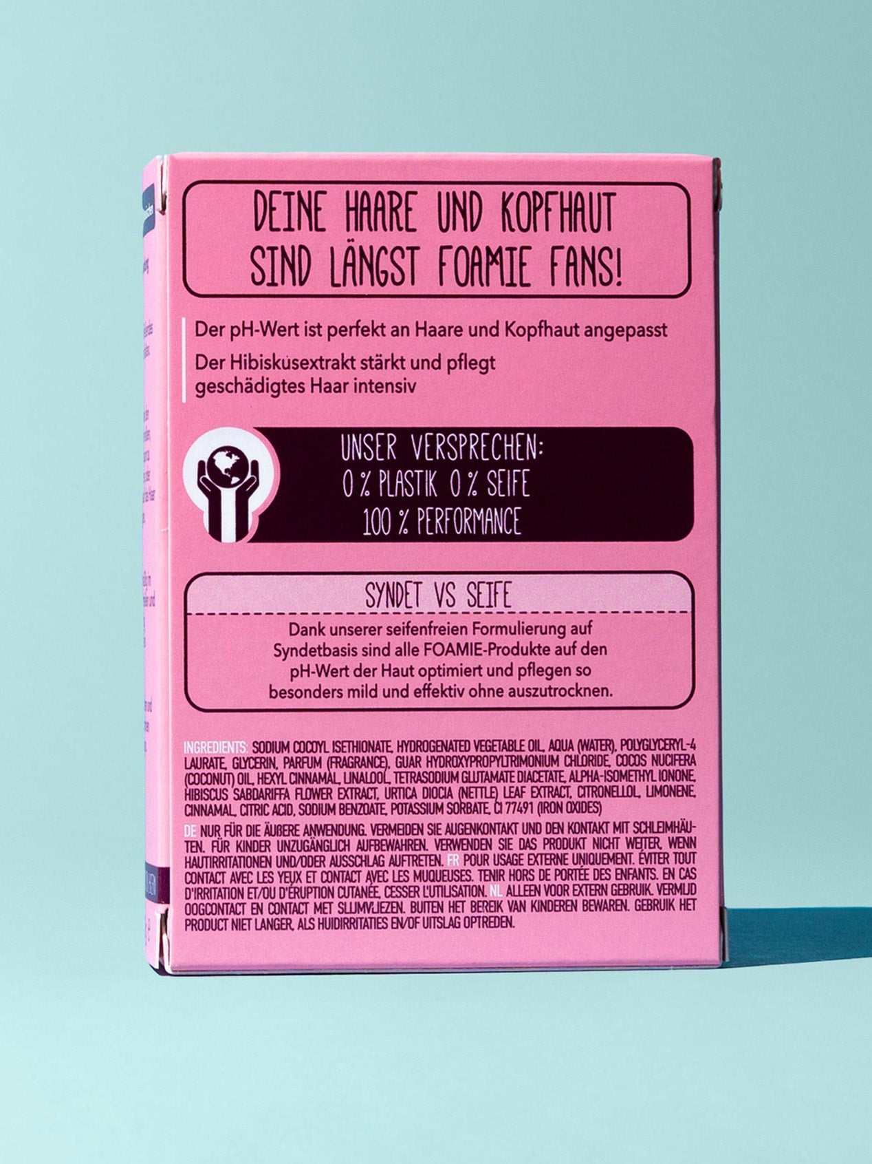 Festes Shampoo Hibiskus für geschädigtes Haar überzeugt nicht nur durch die plastikfreie Verpackung und die vegane Formel, sondern auch mit seiner sanften, gründlichen Reinigungswirkung. Dank seiner hochwertigen Inhaltsstoffe ist das Shampoo exakt auf den natürlichen pH-Wert der Kopfhaut abgestimmt. Es reinigt das Haar wunderbar schonend, zugleich massiert es die Kopfhaut und regt deren Durchblutung an. Neben dem reinigenden hat das Foamie Shampoo einen intensiv pflegenden Effekt. Es ist angereichert mit Hibiskus, der eine wahre Wohltat für strapaziertes Haar ist. Der Extrakt steckt voller Vitamine, Mineralien und Antioxidantien, die nährend wirken und Feuchtigkeitsverlust ausgleichen. Das Ergebnis sind geschmeidige und leicht kämmbare Haare, die kraftvolle Gesundheit und natürlichen Glanz ausstrahlen. Auch Probleme wie Spliss, Schuppen und Trockenheit werden spürbar gelindert.